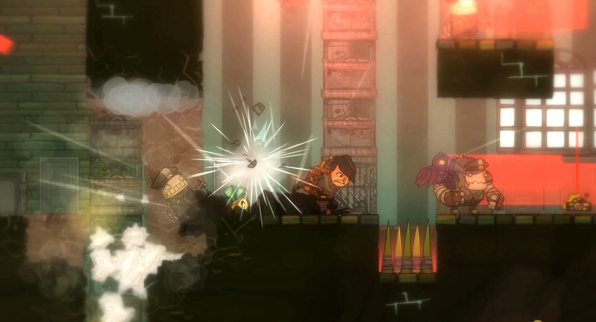 《骗局(The Swindle)》是一款以物理为基础的平台游戏,游戏中玩家扮演盗贼潜入不同室内居所,完成任务后不被发现迅速离开,随着战利品的增加玩家就能不断升级,直到可以潜入无法进入的地方。游戏有点像是《杀出重围》和《刺猬索尼克》的合体。