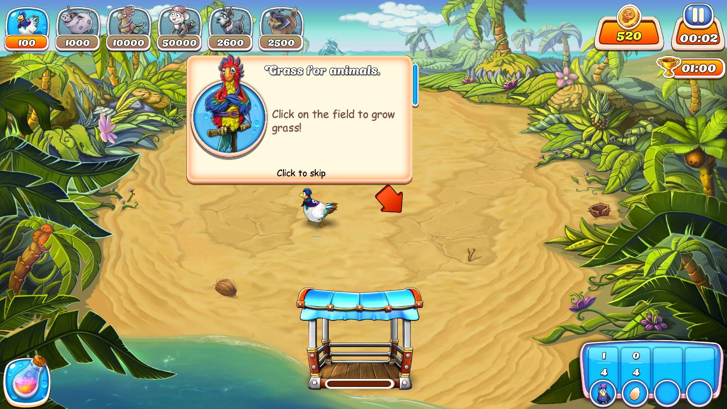 顾名思义,在此模式下,你得跟随着游戏剧情一路往下走,有点类似于闯关的模式。观察游戏界面,在右上角会有任务指标,游戏下方是储物室,点击农场空白处会自动种草,然后就从小鸡这最基本的动物开始养起来来吧。当储物室里的物品满后可点击卖钱,当有足够的钱后就能把农场打造的更高档了。