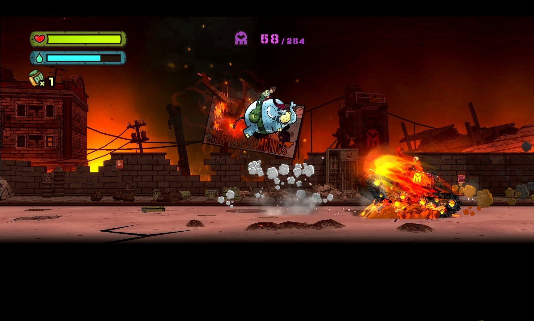 有着浓浓漫画风格的《坏象坦博》背景故事描述了夏尔市(Shell City)面临被带着面具的神秘指挥官所率领的鬼影军团摧毁之际,柯瑞曼将军最终只能寄望猛犸象坦博为夏尔市挺身而出,击退邪恶势力。