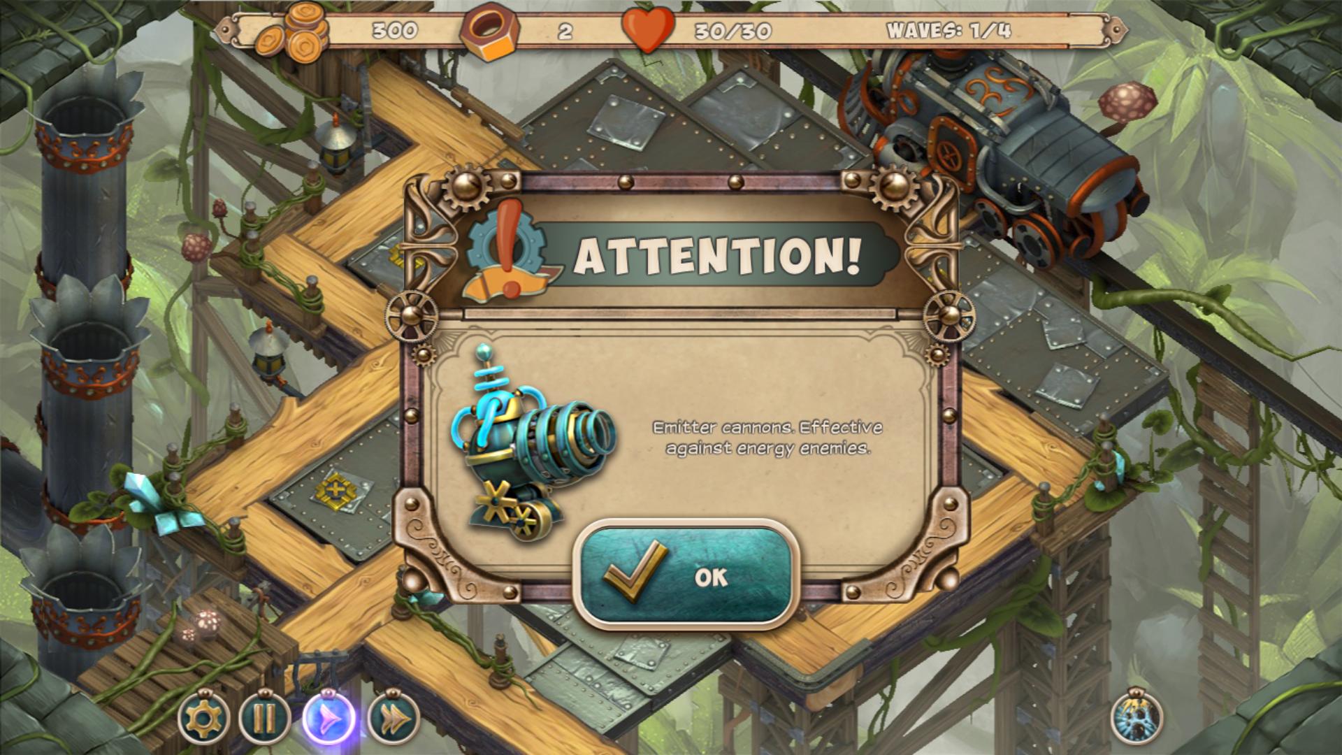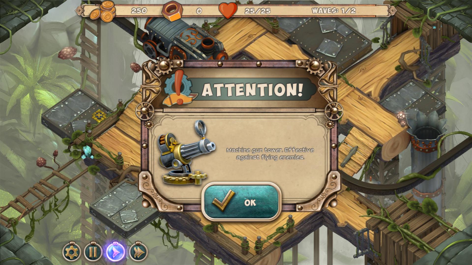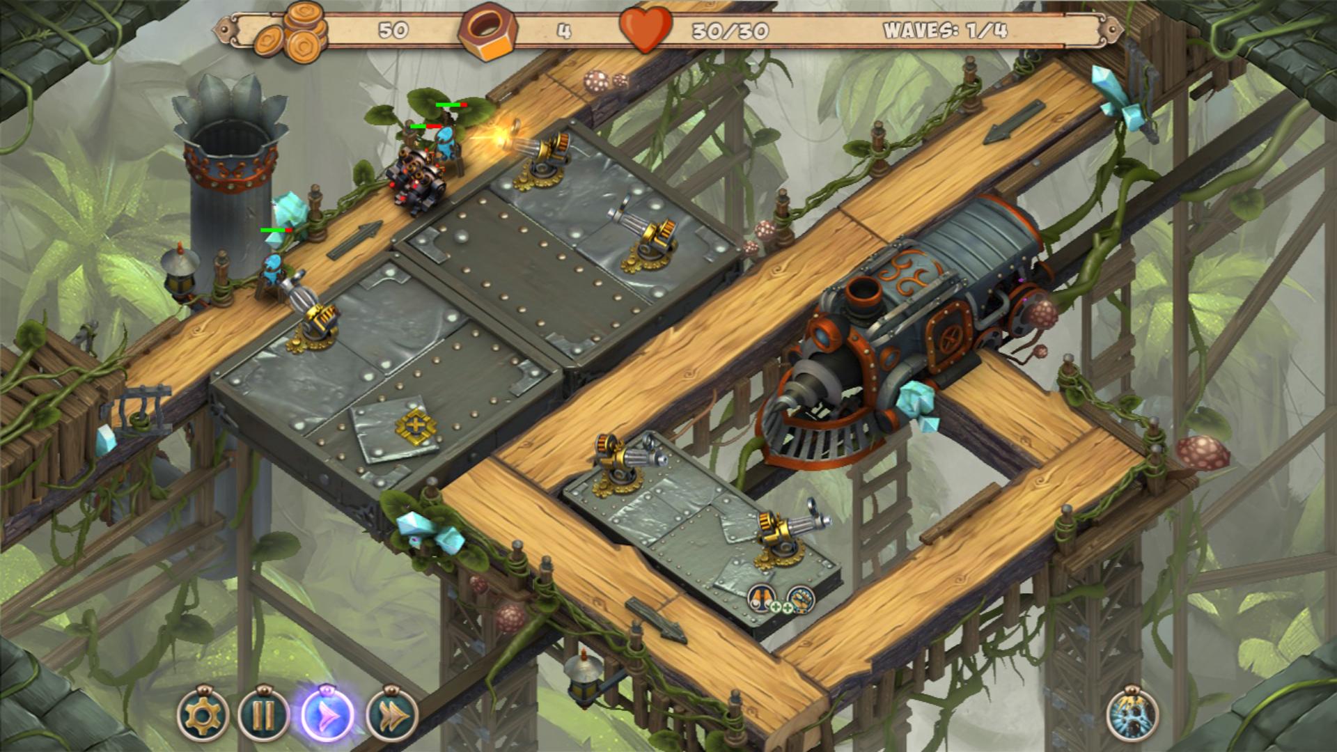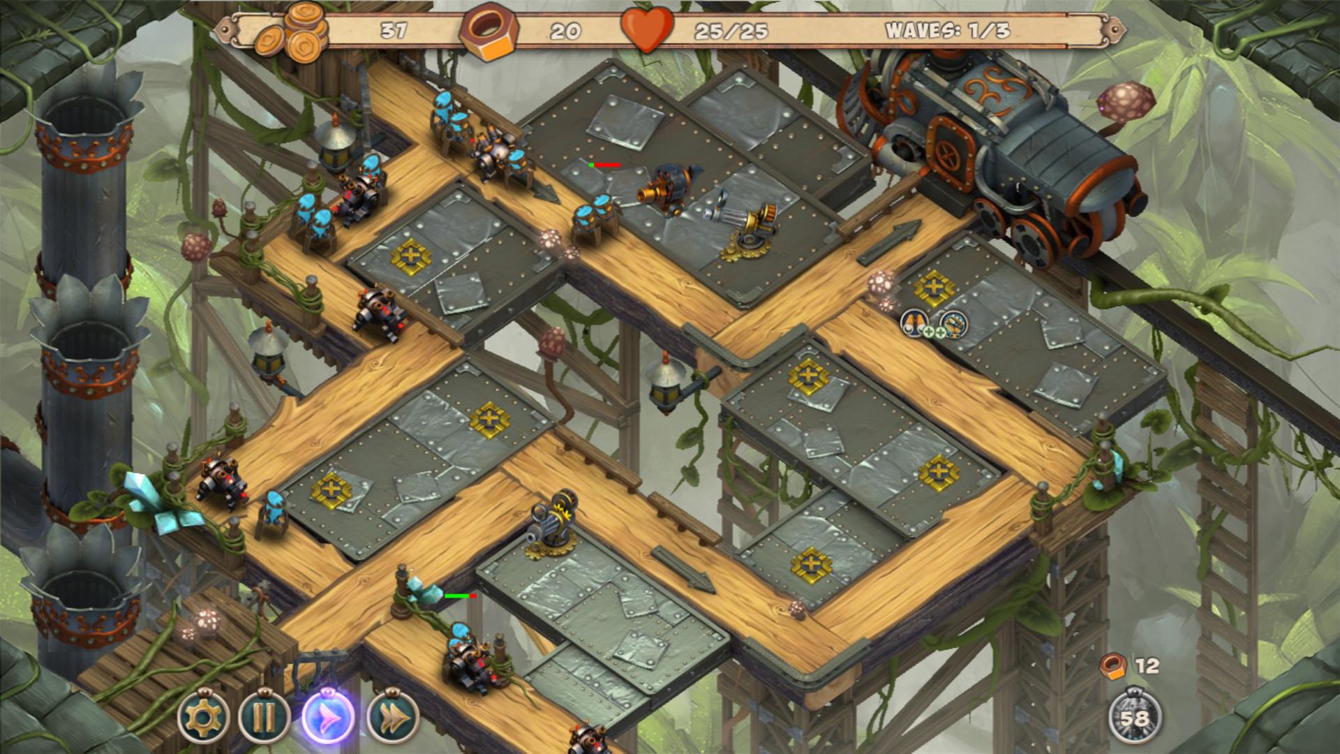 风格迥异的塔防游戏,浓浓的钢铁气息,有着蒸汽朋克的感觉,游戏的整体难度还是比较大的,坑爹的洞口一起稀少的建造基地,不过攻击波数也不多,不像其他游戏动不动就是几十波的,还有一点就是,美工可不可以在懒一点,地图变来变去就是那么几张,开启新关卡不过只是旧地图上的新怪物出现而已,着实有点坑爹