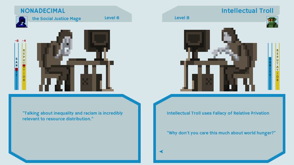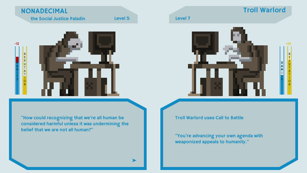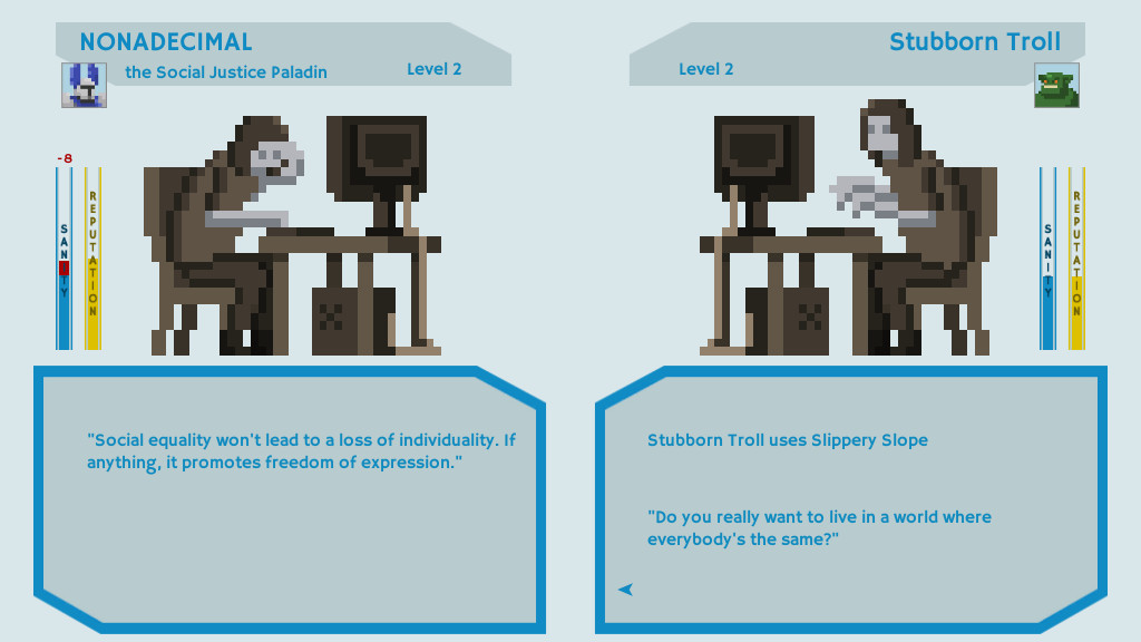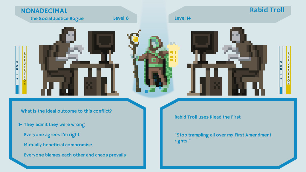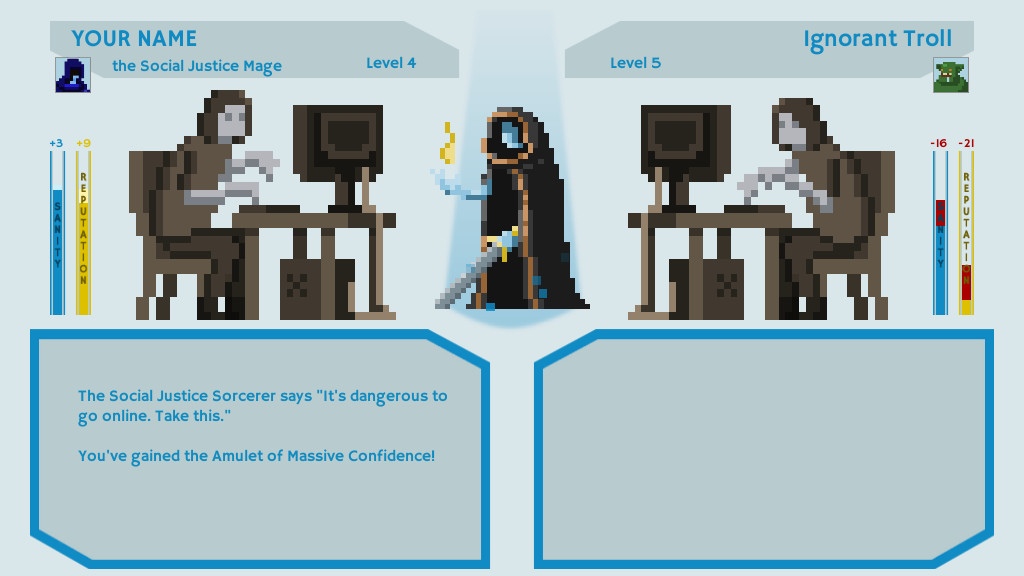 《社交正义战士》是一款颇具讽刺意味的角色扮演类游戏,讽刺的对象自然是网络上那些自诩正义的键盘战士。游戏中你要扮演一名躲在电脑屏幕后面的正义使者的角色,与各种巨魔(主要是疯狂或者无知的人们)战斗,反驳他们的错误观点,用正义和真理击败他们,获得胜利。
