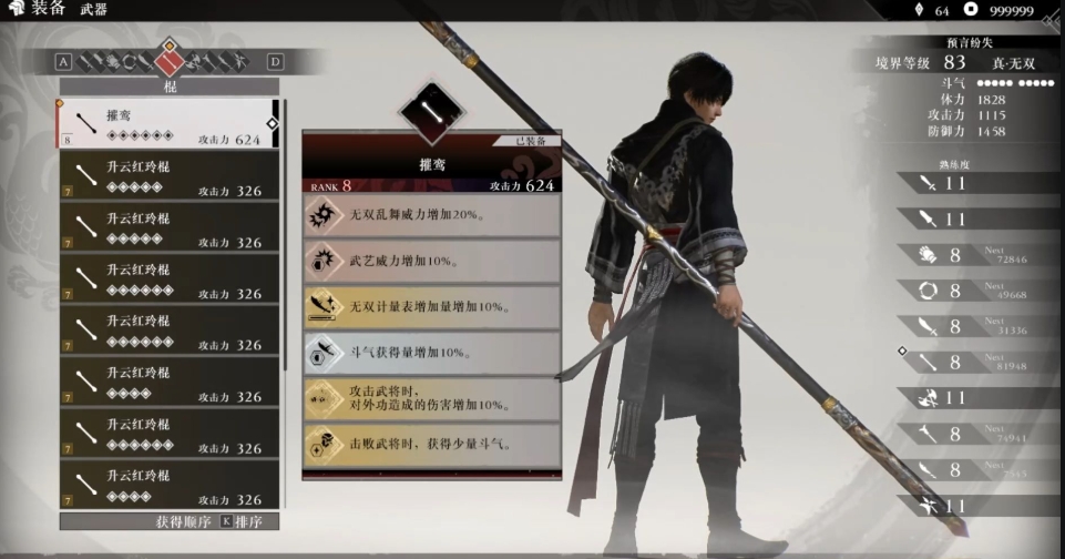 想解锁棍类武器玩家需要在第二章中击败张辽,棍类武器的优势在于拥有高连击数,专注于速度、控制敌人群体和使用空中攻击,跟其它武器的区别在于它不会在地面上造成高额伤害。棍的动作包括快速旋转攻击,跳跃攻击以及将敌人击飞,虽然它的打击力不如其它武器,但能让敌人眩晕并飞起来。