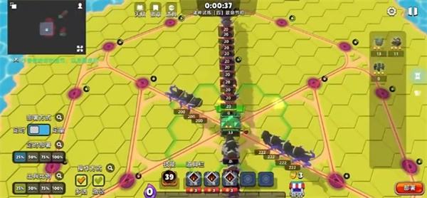 10s时升一级商店,同时利用双击可以重复购买的bug买两个群星陨落,正好可以清理第一波兵。最好只升一级商店,否则后续难度较大。处理完第一波兵之后可以买石头和减速,分别用来挡住下方持续的2兵力和减速右上方的兵。