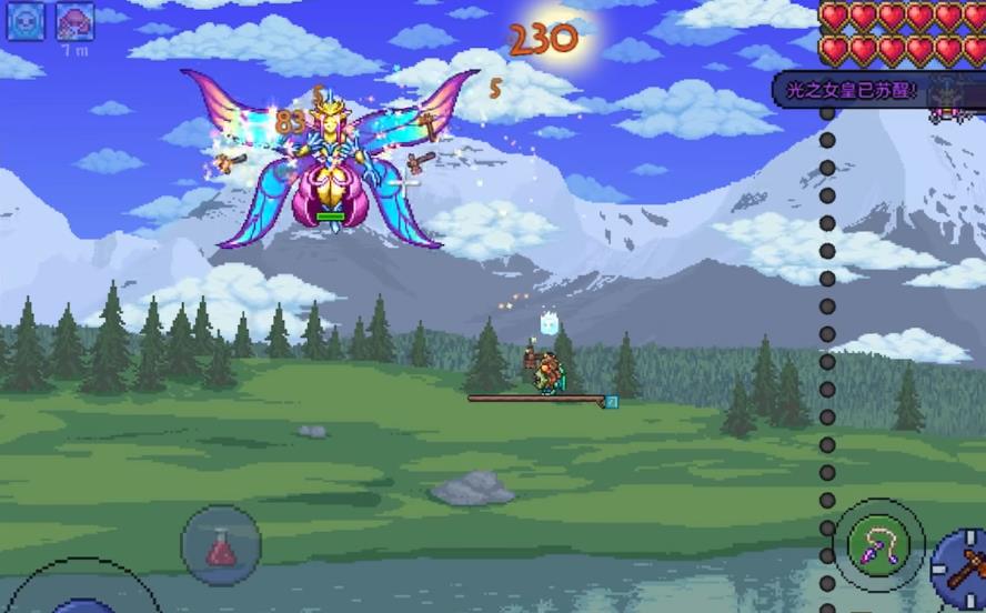 光之女皇在白天免疫所有的伤害,攻击的话自身便会直接暴毙死亡。最为简单过关的便是逃课打法,在打败血肉山后需要完成海盗入侵事件,此时海盗船长npc便会直接入住基地。玩家可以在此处购买大炮,数量选择三十个即可,随后再去寻找到魔法师npc,向其购买一把冰雪魔杖。接着玩家使用具有无限飞行功能的坐骑,垂直飞到地图的顶部,使用冰雪魔杖直接创造出一个物块。
