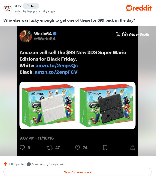 在r/3DS论坛上,一位玩家分享了折扣猎人Wario64在2016年黑色星期五发布的一条旧促销信息:New Nintendo 3DS只要99美元。让所有人都感到后悔不已。