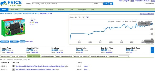 时至今日,据PriceCharting报道,超级马里奥“黑色版”3DS的售价至少为300美元,如果想要盒装完整版 (CIB) 或全新版本,价格还会更高。