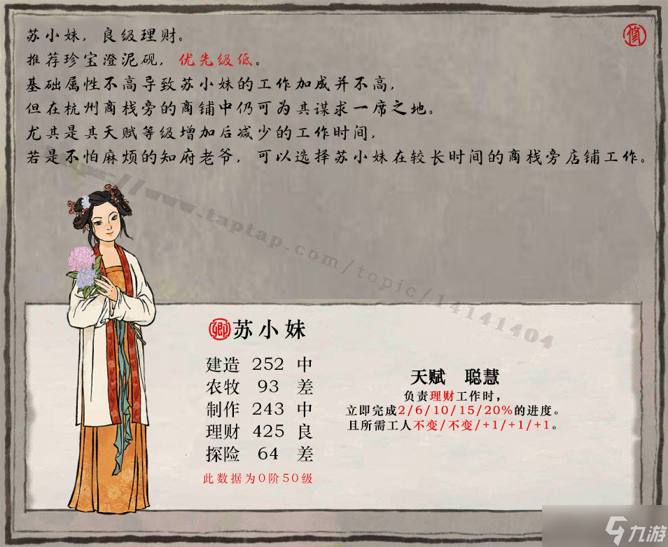 1、苏小妹的基础属性不算高,只有理财是良级的,其他都一般。